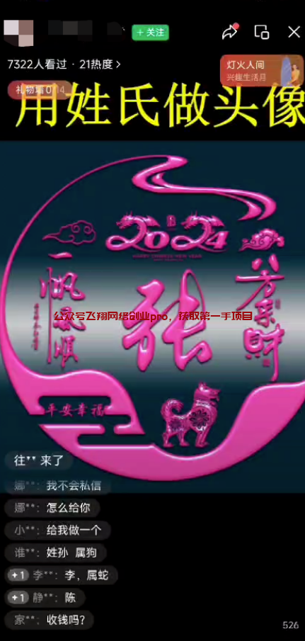 大家好,我是飞翔!今天给大家分享的副业小项目是关于姓氏图片的,之前刷到过这样的直播间,看起来非常普通