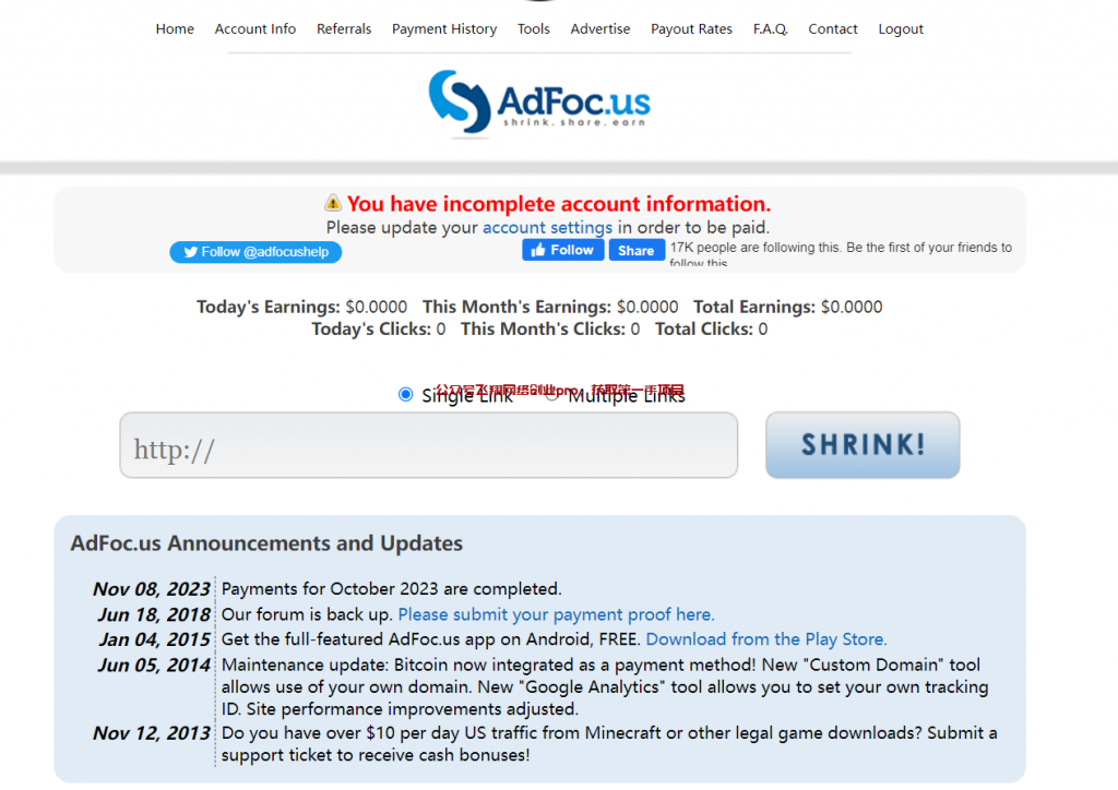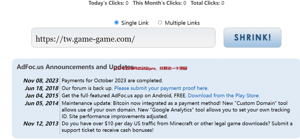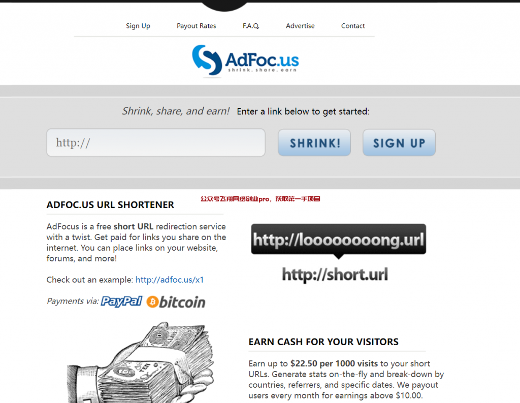这个项目名字叫Adfoc短链项目,这个站点是一个可以把长链接变成短链接的站,你随便找个网址,通过这个站点,生成了短链接,别人访问了你的这个短链接,后台就有美刀