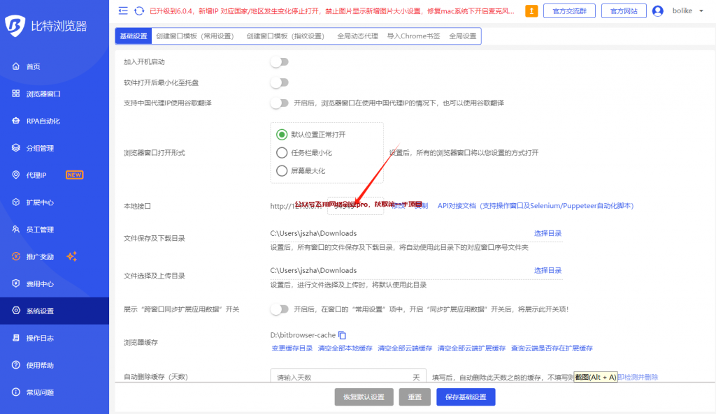 7.接着安装比特指纹浏览器,点右上角个人设置,把里面的本地接口改成54345,然后点击保存
