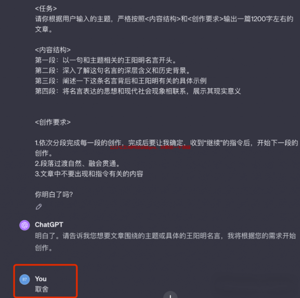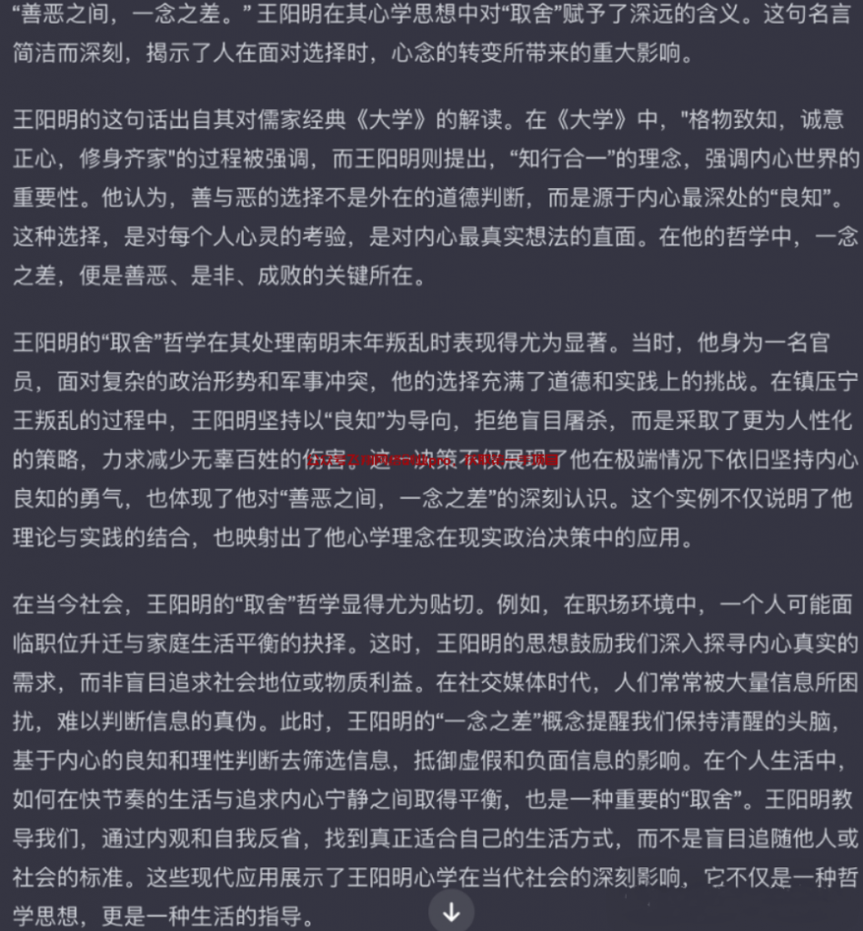 废话不多说,我们直接用GPT给大家举个例子:写一篇“国学王阳明的文章”(如果不方便用GPT的,可以用国内的文心一言之类的,效果也是可以的,只不过我个人觉得GPT更完善一些)