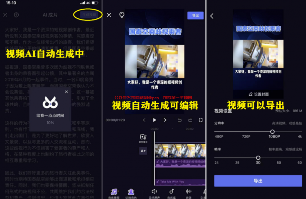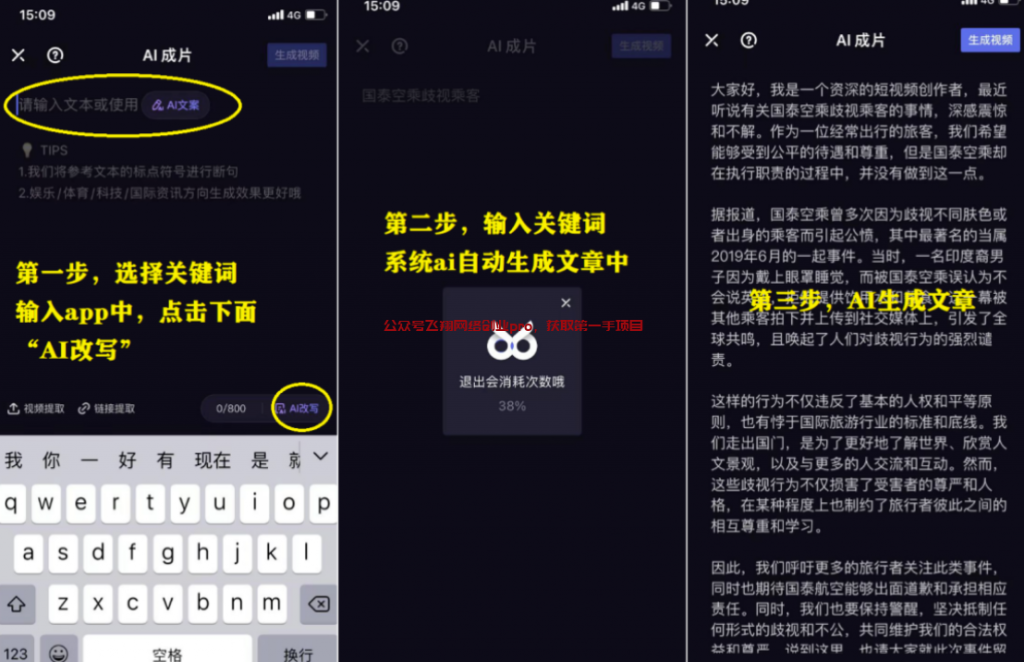 我们以这两天的热点:国泰空乘歧视乘客,作为关键字,进入“AI成片”,然后输入关键字后AI自动生成文章,如下图