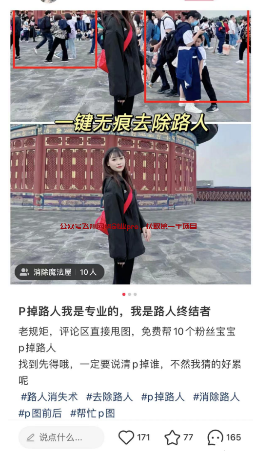 大家好,我是飞翔!今天给你们分享1个搬砖的小项目:P掉路人项目。现在周围不少人在弄,据说效果还不错