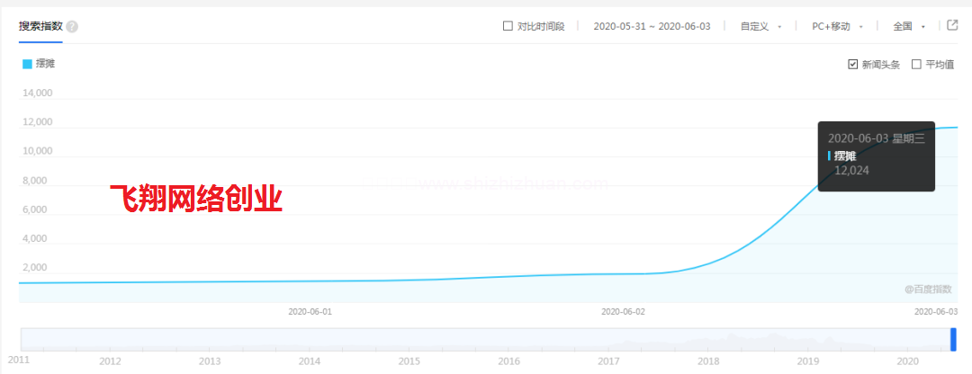 看百度“摆摊”这个词的搜索上升趋势,说明这个概念确实有赚钱的机会,不仅仅指摆摊这件事。