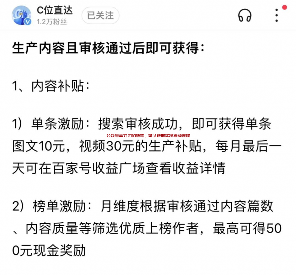 而且除了视频补贴以外,百度C位直达还推出了图文奖励,图文内容通过审核是10元的补贴奖励
