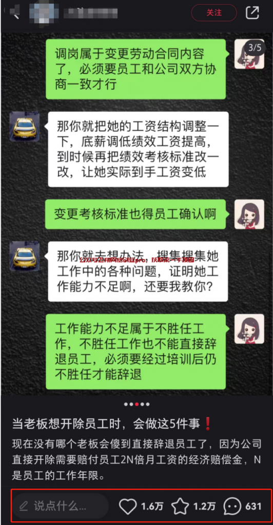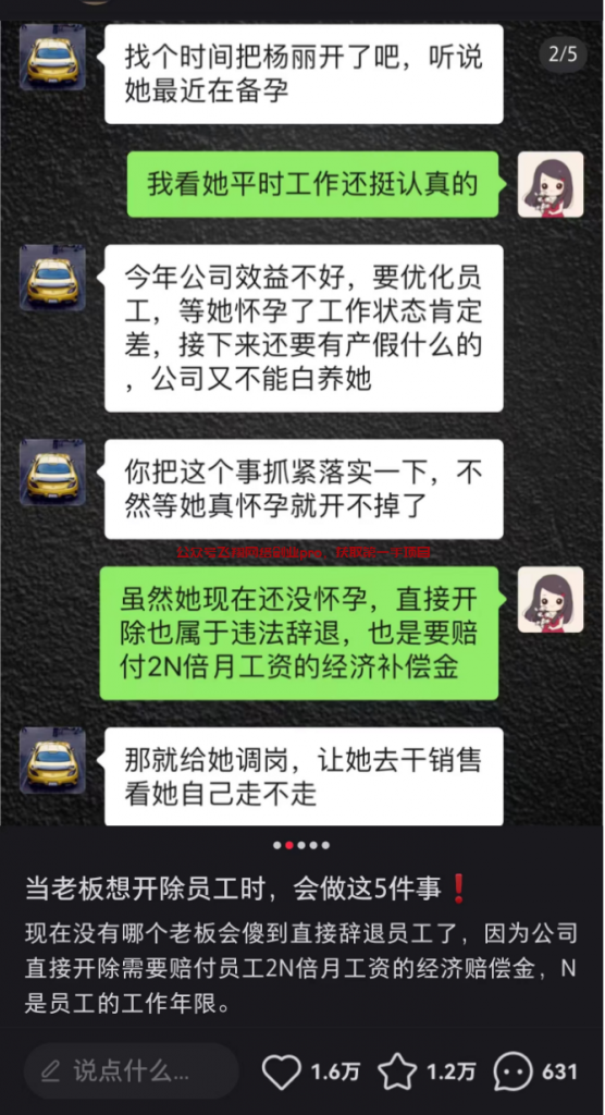 看看下面这个聊天,把怀孕的员工开除,不好直接开,就想办法,这是很多公司干的事情,在聊天时候就把法律的知识植入进去,这个玩法很有意思,很多类目都可以借助这个思路去操作