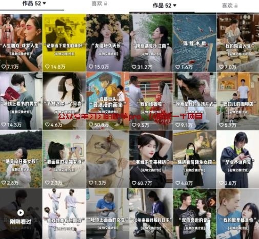 下面这些视频每条都有几万、甚至几十万的点赞量,其实就是通过同一种套路拍了52条,这种玩法厉害的地方就是在于,不用你去考虑如何选题,也不用考虑视频怎么拍的问题,因为这里面的套路都是一模一样的