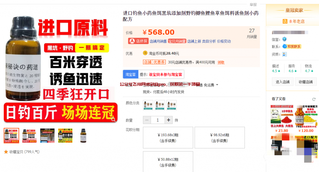 把一款成本几块的钓鱼小药包装成“黑坑钓鱼发财秘籍”,卖你199不贵吧
