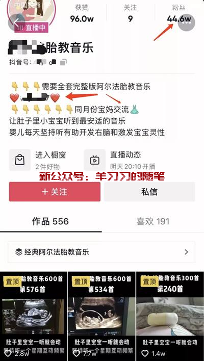 之所以我们看重抖音胎教音乐这块的市场,也是抓准了宝妈们望子成龙的心态,通过胎教音乐吸引来的粉丝,最起码90%以上是宝妈,粉丝非常精准