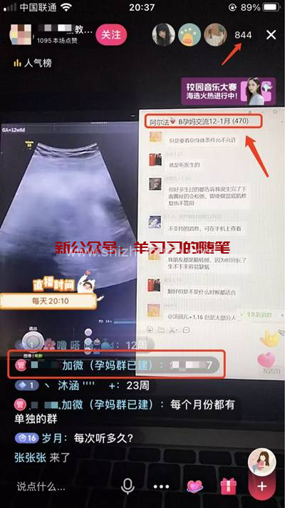 直播间的内容用的是投屏,左边是一个b超的动态视频,右边是一个宝妈微信群的聊天实况,5百人的群已经快满员了,不得不感叹,宝妈的生意是真的很红火,只要你瞅准她们的需求,花钱是轻松痛快的。