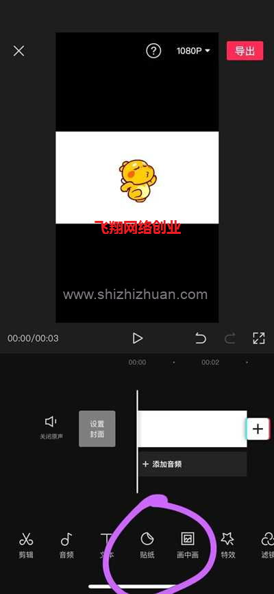 然后我们找到贴纸这个功能,,拉到最左,选择添加手机内图片,依次导入你选用的表情包素材。