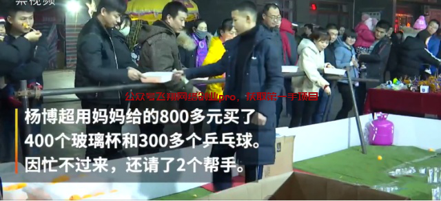 他买了300个乒乓球和一些玻璃杯,玻璃杯里放着金额不同的钞票(从1块-100块不等),只要参与者能把手中的乒乓球投到玻璃杯里,就能获得相应的钞票