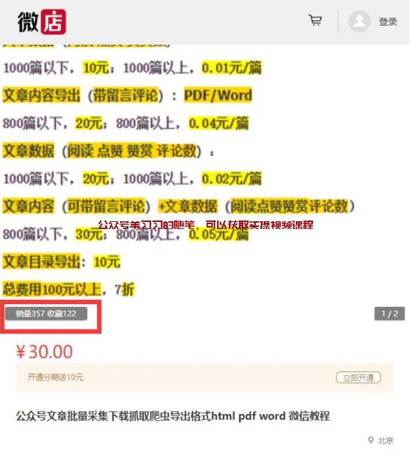这个微店就一个产品,就是卖采集文章的服务的,一个月销量有357件,每件收费30,一个月下来收益就过万了