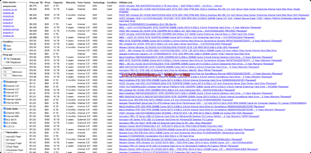 前段时间看到一个网站叫做diskprices,这个网站就是一个非常极简的表格,没有任何UI的美化,但是网站却展示着非常重要的信息,它主要是通过抓取Amazons所有的硬盘相关信息的销售链接,然后通过一个表格的形式罗列出各种相关参数提供给大家参考,帮助有需要的用户可以快速定位自己所需要的产品