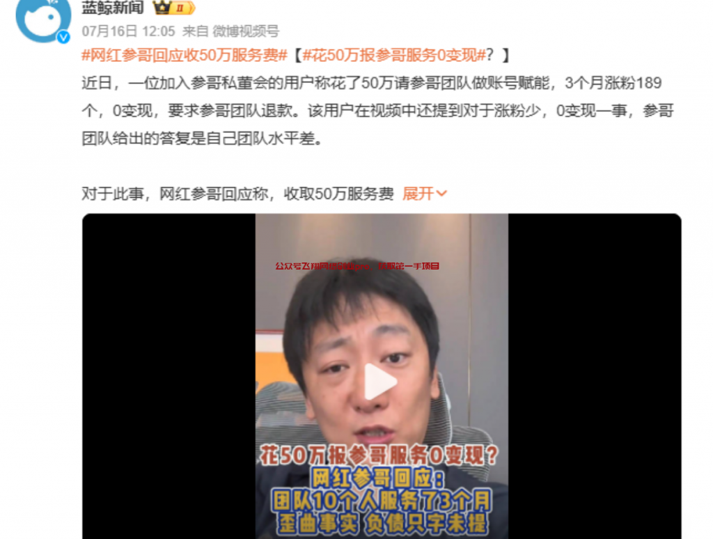 这两天知识付费行业最火的新闻,就是参哥的50W,3个月陪跑事件!一个老板给参哥交了50万,交付了3个月,涨粉189个,零变现,然后让参哥退钱,参哥不退,就闹得很大