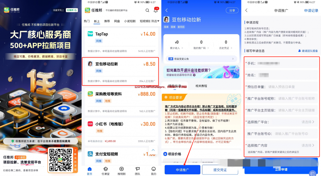 1、申请授权扫码注册任推邦平台后,找到豆包移动拉新这个项目,在项目详情页进行报备