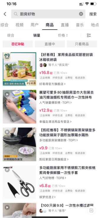 我们假设以家居厨房用品为例在抖音上查找对标账号,我们搜索“厨房好物”