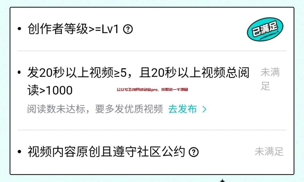 创作者等级≥1级发布3个视频就可以,符合平台规则这条基本不用管,只要不搬运一般没事,这里面唯一有点难度的就是这个阅读量>1000。