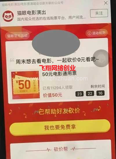 例如之前猫眼有个好友助力砍价免费拿票的活动