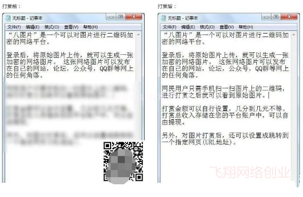 这里面有一个技术难点,扫码收钱和自动发货。其实很简单,有一个叫八图片的网站,大家可以自己搜索,这是一个自动收款的平台。它可以帮你实现用户扫码付款后,自动发送你设置好的内容。可以实现一个最简单的自动发货系统。 这个网站还有一个功能,帮你把一张图片打马赛克,用户扫码付款后可以去掉马赛克。 所以,你也可以直接把百度网盘的地址或者密码,直接放到一张图片上,再放上收款的二维码,实现扫码付款后自动显示。类似下面这样,介绍的部分可以显示,重要的内容隐藏了,需要付款后才能看到。