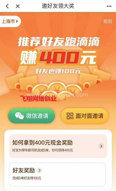 大家好,我是飞翔!今天给大家分享滴滴拉新的赚钱活动,滴滴拉新客单价高,线上线下可以同时操作,是个长期的拉新活动