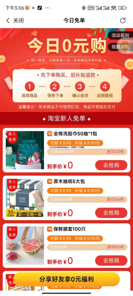 登陆后首页可以0元购一单,大家可以随便买点纸巾或者其它的小商品