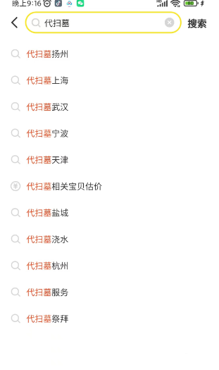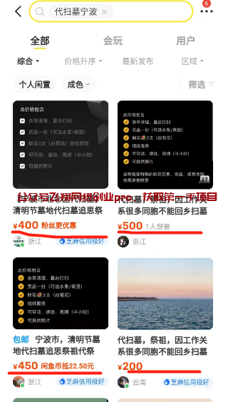我们在闲鱼上搜索关键词,下拉词里有很多城市的代扫墓关键词,这就是一个很好的获客渠道,趁着清明节这段时间,多准备几个闲鱼号,比如你做宁波市场的,就把代扫墓宁波这个关键词全部占领,批量多上几十个同类产品,名称文案图片变换一下,同城霸屏,让用户搜索出来就是你的