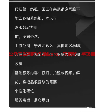 前两天在一个华侨论坛里面,看到别人发布的一个代扫墓的帖子,具体内容就是为华侨友人代上坟业务,全国范围内都可以接单,代扫墓内容包括鲜花酒水、扫墓纸钱、花圈祭拜等等,算是一条龙服务了,高端的还有定制服务,可以根据当地的风俗习惯专门定制不同的套餐