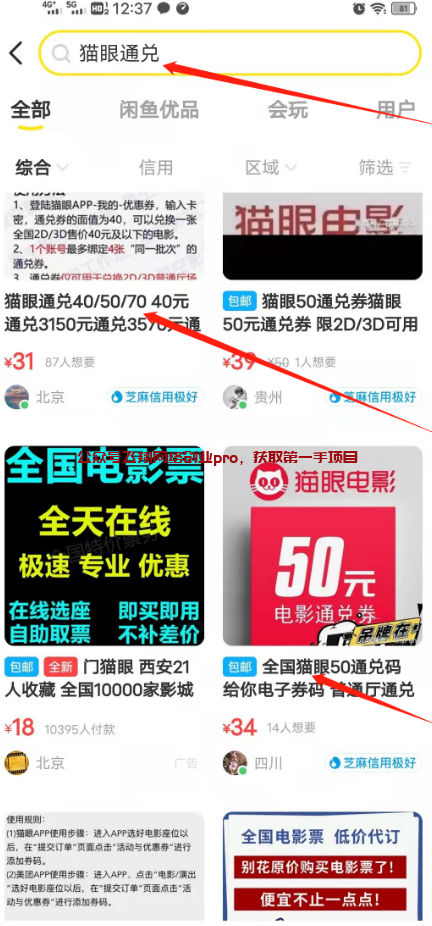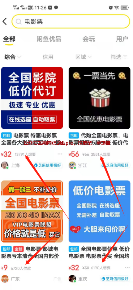 一、直接小黄鱼批量开店,你去小黄鱼搜一下关于电影票的店铺,非常多,小黄鱼本身就自带流量属性,而且电影票这个东西也是自带流量属性,所以找同行对标一些话术就可以了
