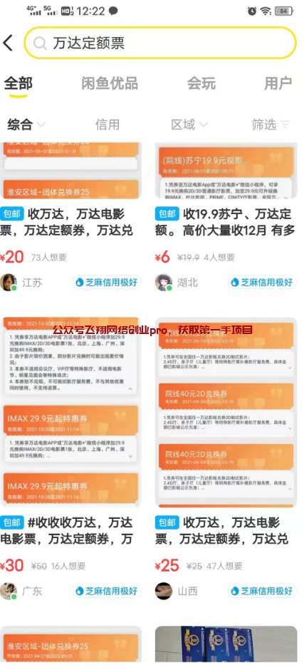如果你手中有票,但是卖不出去,也不想看,也可以去小黄鱼搜关键词:收电影票、万达定额票等,把你手中的票卖掉