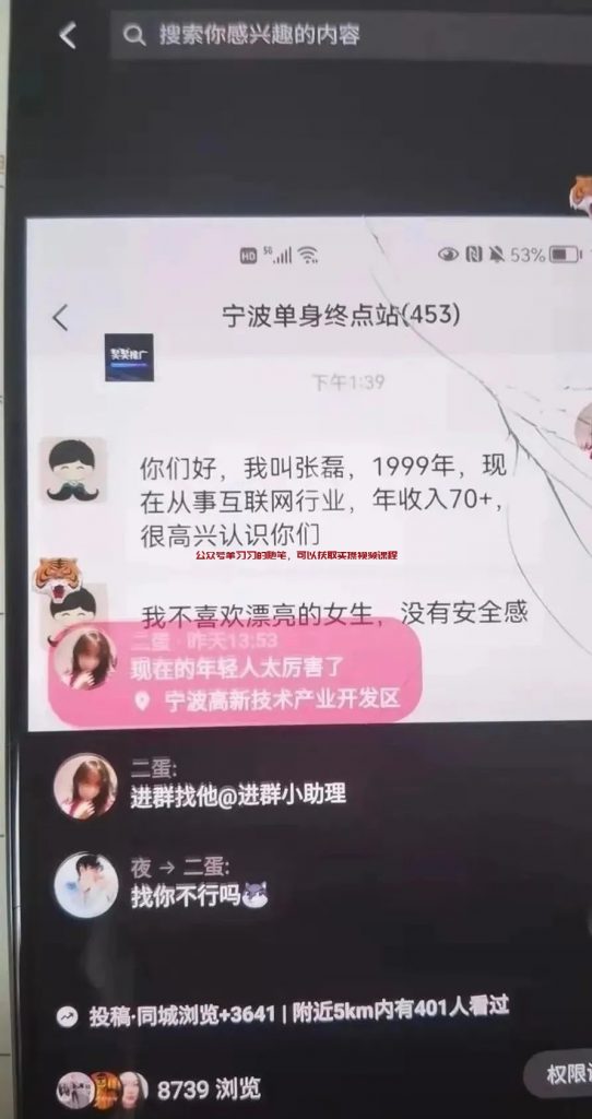 大家好,我是飞翔(V:2944984903)今天和大家分享一个暴利的赚钱项目,就是抖音同城相亲项目,有同行操作这个项目,一天收益5位数,非常的牛X,能有这个成绩,我是非常佩服的,不过据我所知,操作这个项目是需要非常强的执行力的