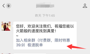 微信里面相亲这个项目几百的转化率其实挺高的,因为对于一个单身男生来讲,请一个喜欢的女生吃顿饭也要几百,如果在线上能认识,并且邂逅一个同城喜欢的女生,其实男生是愿意付费的,几十元压根就不会放在眼里。