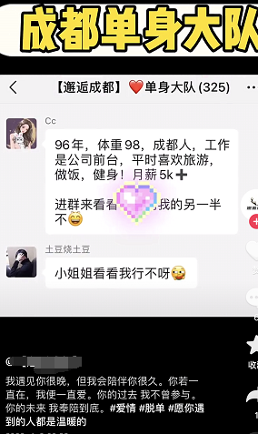 比如下图就是一位同行的作品,发布的是微信相亲群的聊天记录,内容非常简单,就是一个文案