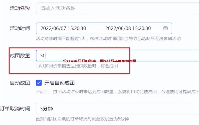 如果正常开团的情况下不用注意那么多,你就设置五人拼团,价格拉低,每24小时设置一次就没问题了