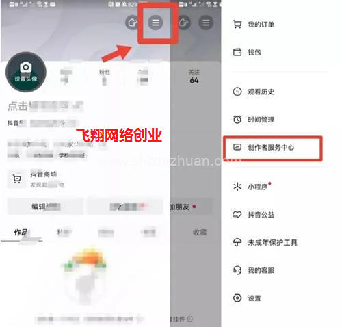 2、点击右上角“三条横杠“,在弹出的页面中选择“创作者服务中心”