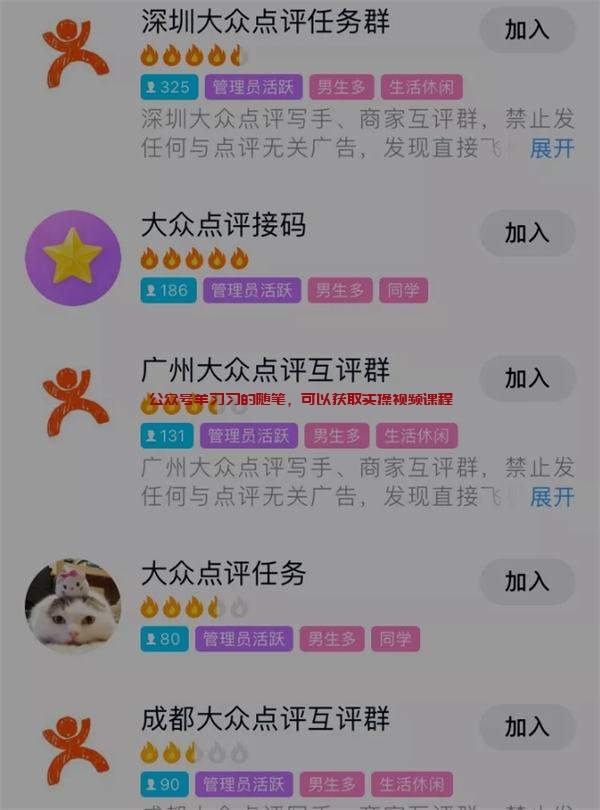 我们可以在qq群里搜索类似的关键词,比如大众点评任务群,可以搜索到一大堆的任务群,再精确点,可以在关键词前面加上地域,比如上海,深圳