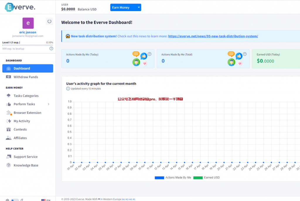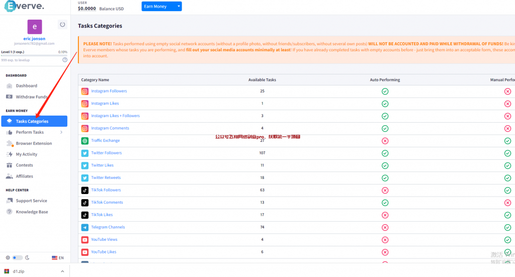 大家好,我是飞翔!最近看到有人在卖国外everve平台的全自动挂机点赞关注的项目,说是脚本全自动给INS,推特,tiktok等平台点赞关注评论赚钱的,一个窗口一天大概1-2美金,一台电脑可以开很多窗口,一天大概可以赚30美金。每天把脚本挂起来就行了,脚本全自动运行,不需要人工