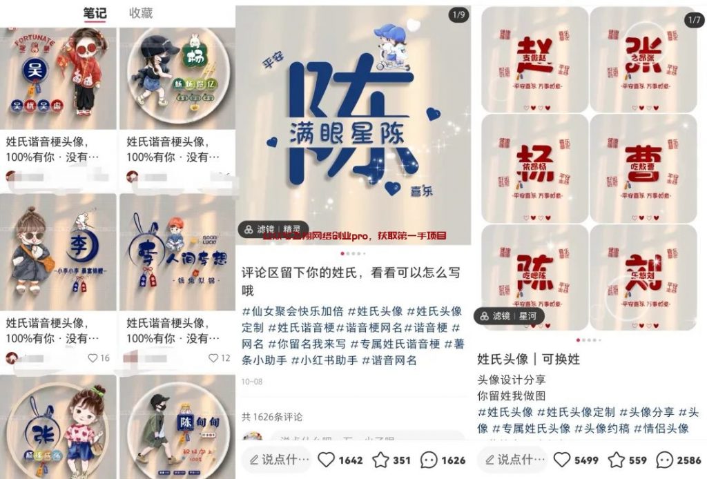 以下面的这个账号为例的话,真的非常简单,可以看一下这三个图,只要生成非常有创意的姓氏头像图片,3-5张图片就是一个笔记,结合一个跟姓氏谐音的成语,就可以做成一个非常简单、美观的笔记了