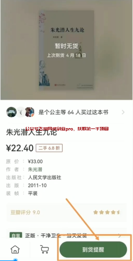 1:咱们需要先知道商家的背景,货是怎么来的,从哪里来的,假如做有货源模式,那就先注册多抓鱼的账号,一个微信号可以注册一个账号,进入到小程序后,看到想买的书,直接加入购物车就行了,假如遇到没有货时,可以点击到货提醒