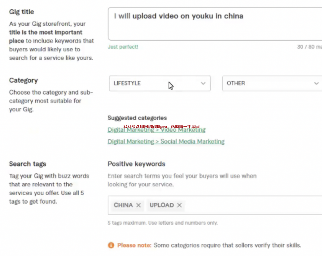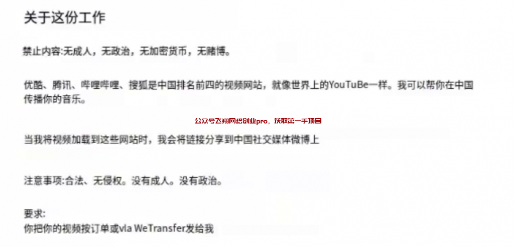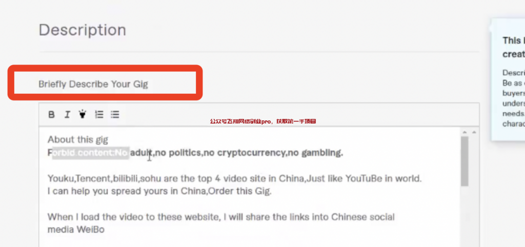 在最后这里有一个注意事项,那为什么要填这个呢,因为我们不是什么视频都可以代上传的,比如涉及政治啊,虚拟币这些的,我们都不能接单,所以我们可以把这段话写在这里。
