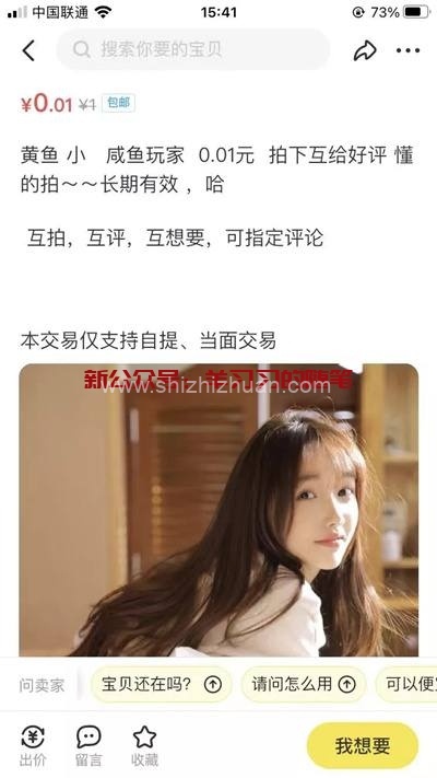 看到这个0.01元的宝贝,和淘宝上卖壁纸的套路是一样的,快速给店铺上钻的操作手法,这个策略放在闲鱼上一样有用 你可以在店内设置这样一个宝贝,然后和其他人互拍、互评、互想要、互评论等,用以提高自己店铺的信誉以及售卖宝贝的权重,毕竟你的宝贝互动数据越好,闲鱼越默认你卖的是一个优质宝贝,从而给你倾斜更多流量。