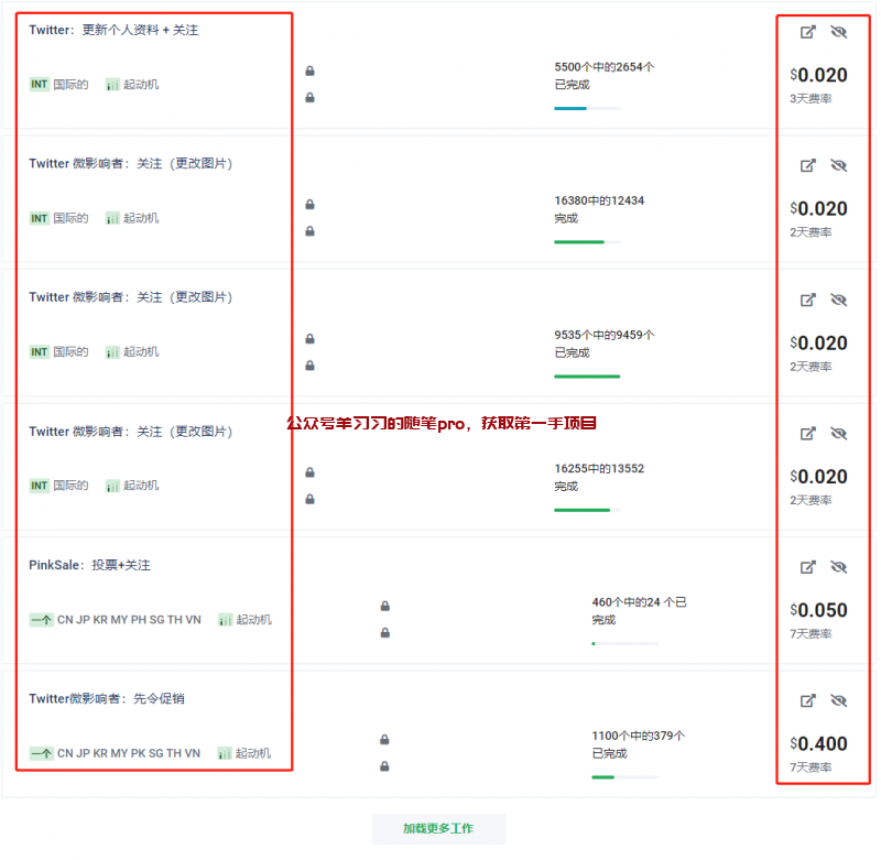 例如Twitter关注类的任务,我们可以很清晰的看到这个平台发布的任务和受益