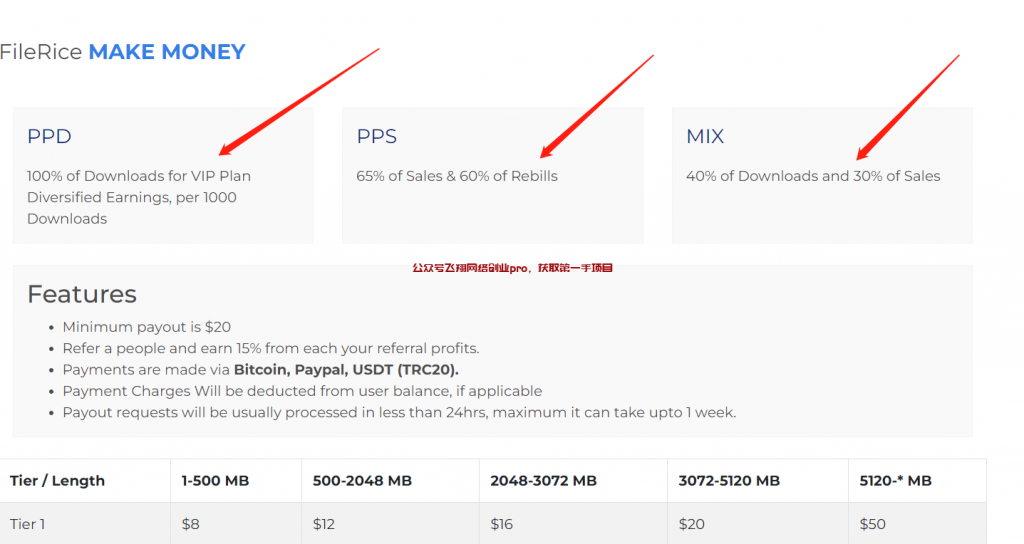 例如你上传了一个文件是Tier1这栏的国家的人下载了,那么你将获得这栏里的佣金,可以看到这栏基本都是欧美国家的,佣金比较高,1-500MB大小的文件是8美金。文件越大,下载所需的流量也就越多,金额也就越高,最高可以达到50美金