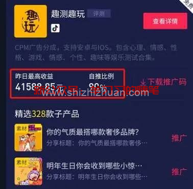 当别人刷到你的抖音时,会看到小程序入口,用户点击这个小程序链接进入后,在观看广告之后进行测评,你就可以得到分佣金额的80%收益,分佣金额=广告分成的80%;