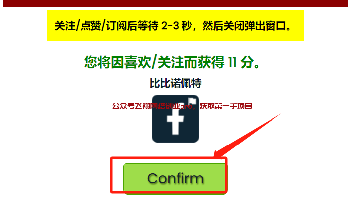 然后会弹出一个窗口,提前登录好自己的账号,点关注或者点赞后,等待2-3秒,关闭弹出的窗口即可,然后点这个确认即可,等待系统确认就可以了