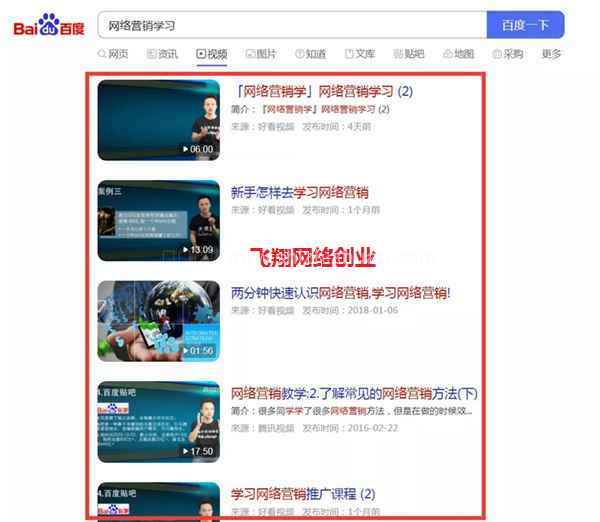 下面是我们自己操作的百度搜索【网络营销课程】的视频霸屏案例: