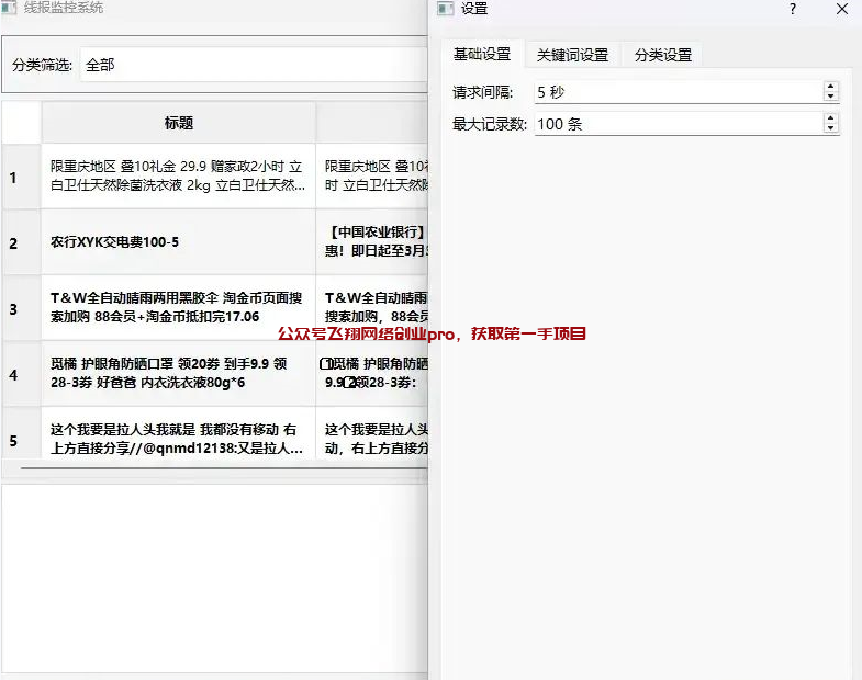 大家好,我是飞翔!今天给你们分享一个撸羊毛的必备神器:线报监控软件。线报监控软件能帮我们实时盯着微博、京东、淘宝、拼多多这些大平台的优惠信息,一旦有动静,立马推送消息给你