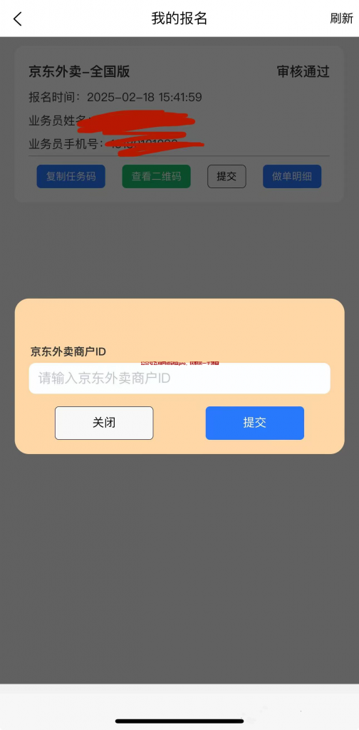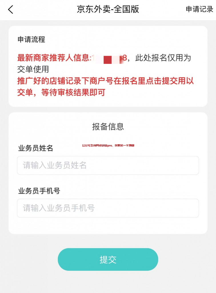 渠道注册好之后在首页找到京东外卖点进进去,申请一个推广码,把你的姓名和手机号都填写好