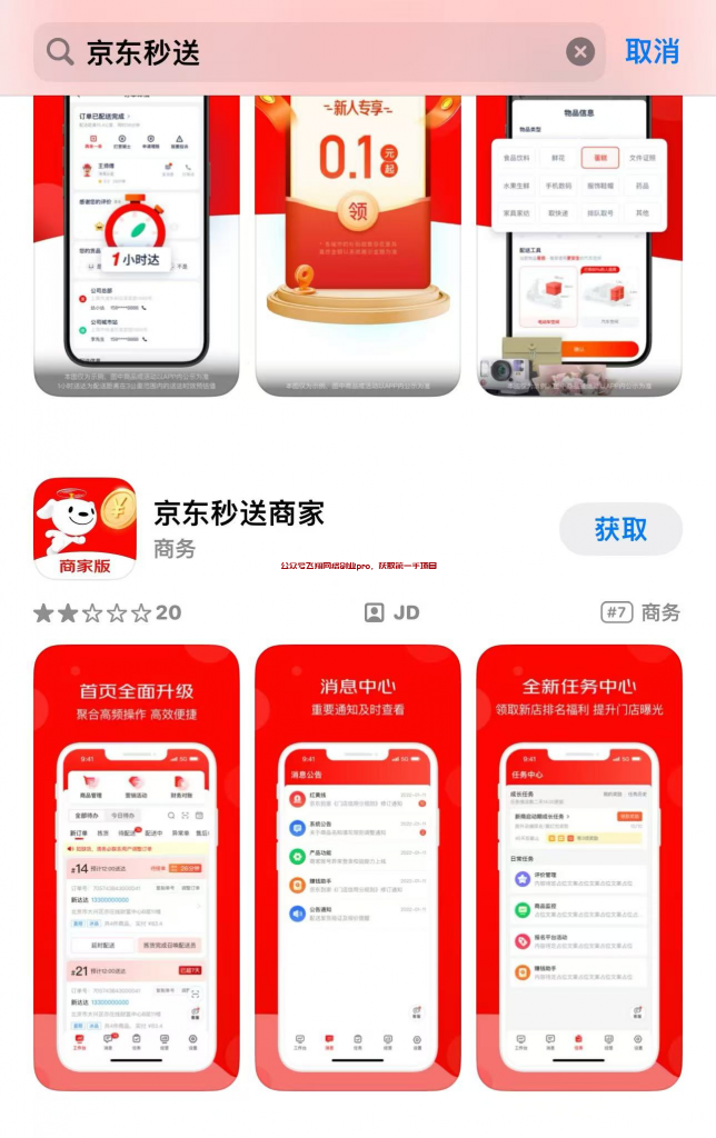 然后在应用商店搜索京东秒送并且下载APP,这个APP是帮助商家入驻的,下载好之后下方有一个入驻申请先帮商家注册个账号。