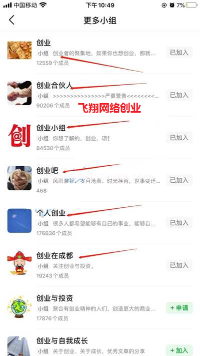 比如引创业粉,那就以关键词:创业、赚钱、电商、副业等词搜索小组。