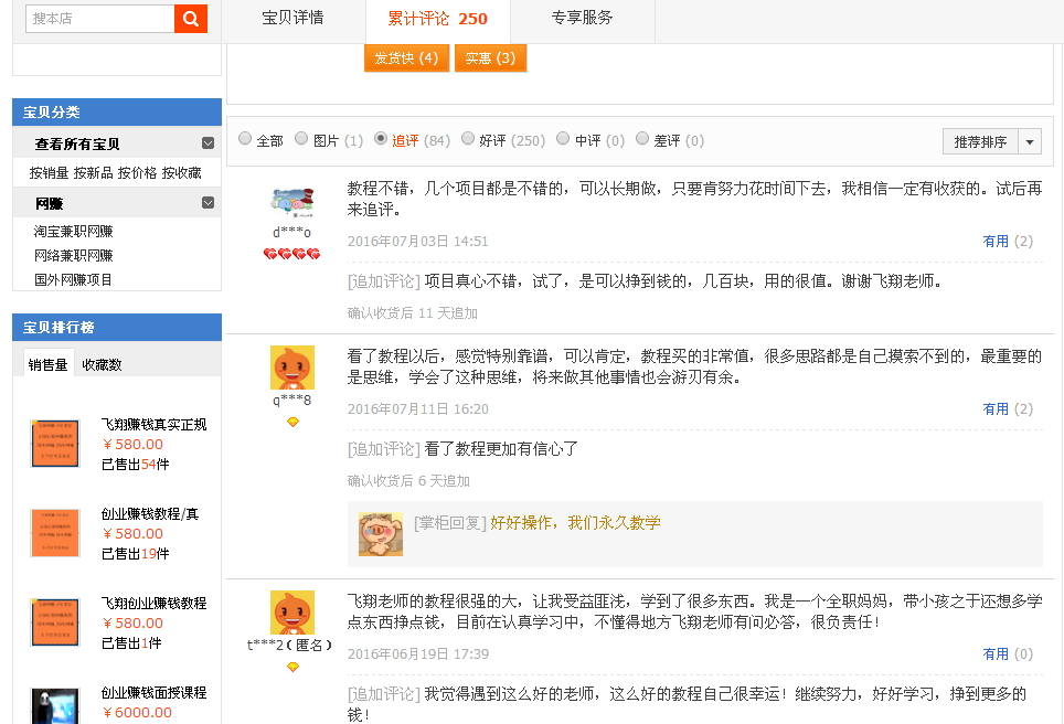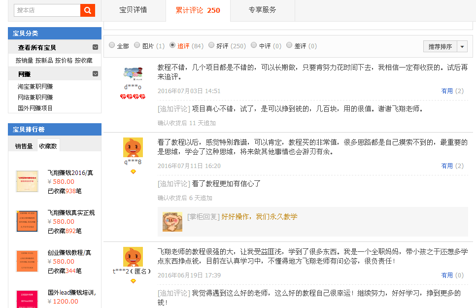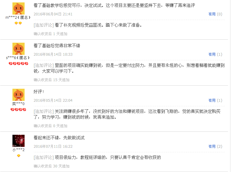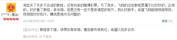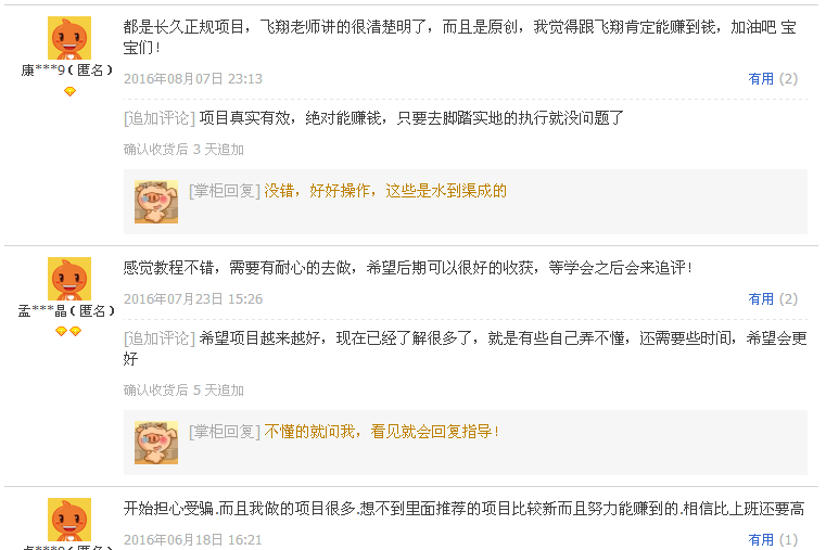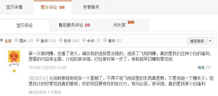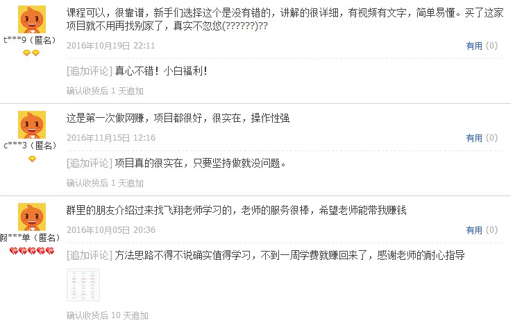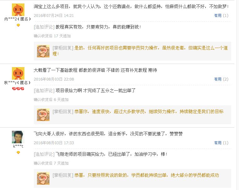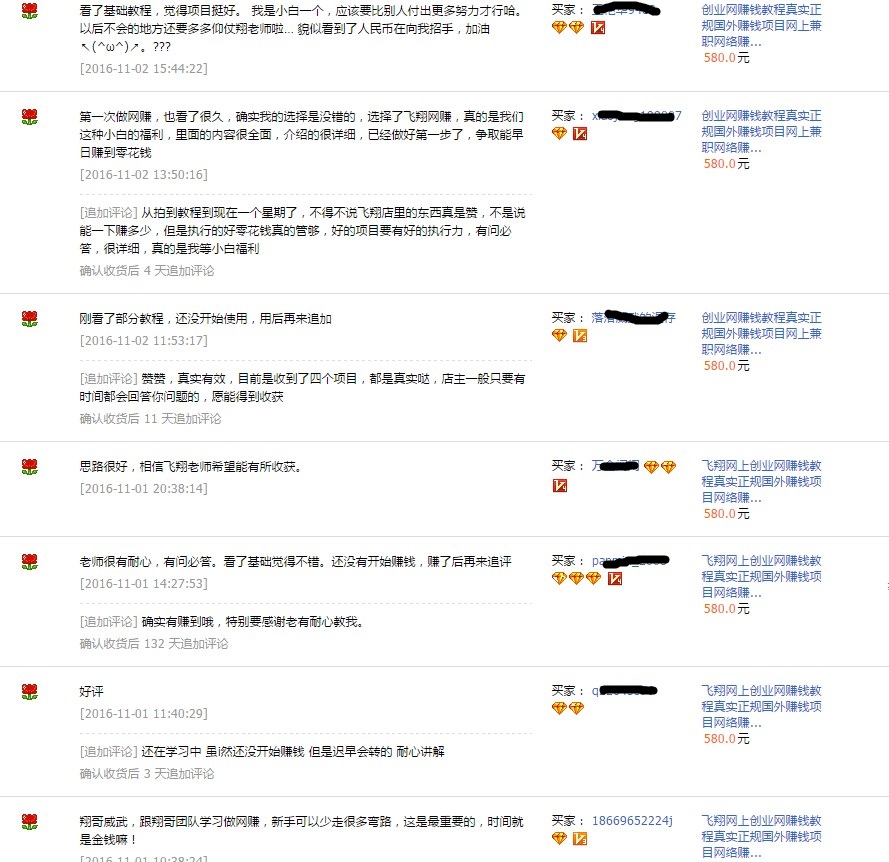 前言:相信很多朋友是通过淘宝这个平台认识飞翔的,也有些朋友通过一些网赚群里分享的一些飞翔原创网赚教程认识了飞翔。飞翔做网赚做了9个年头,淘宝上做网赚培训到2017年为止做了5个年头(目前淘宝做网赚类产品最久的一家,不管是店铺信誉,还是历史成交记录)项目售价在淘宝上属于比较贵的那种,因为我们做的都是一些原创项目的培训,有国内的网赚,也有国外的一些(淘宝上不少盗卖飞翔教程的人)这么多年的学员达到4位数以上,成功了很多,有稳定月入几千的,也有几万的更高的,当然,也有某些失败的,这期间有赞扬,有欢笑,也有咒骂,不满意的
